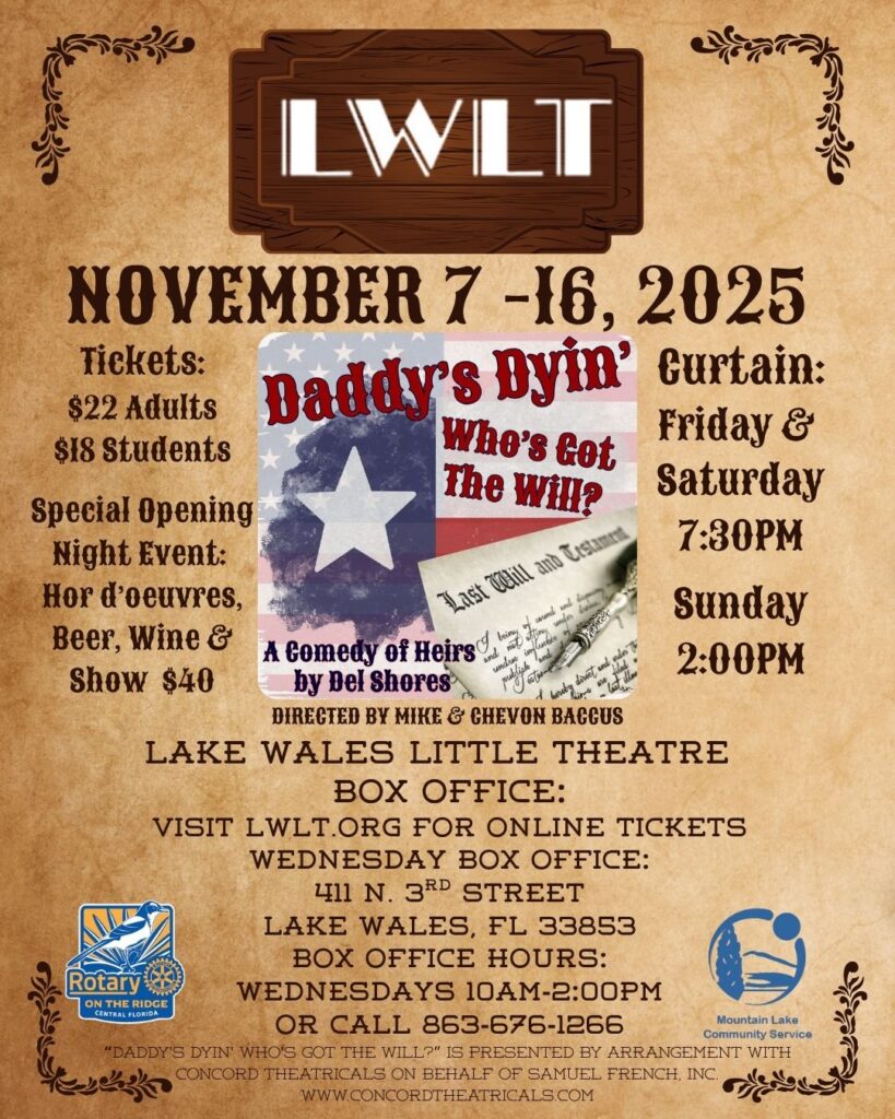 - Where: Lake Wales Little Theatre, 411 N. 3rd Street, Lake Wales, FL 33853